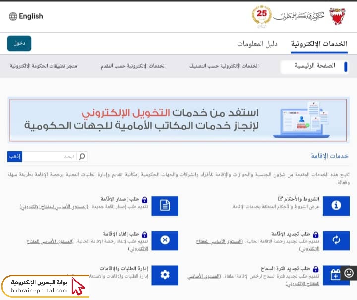 يمكن تقديم طلب إصدار الإقامة في البحرين عبر الخدمات الإلكترونية لشؤون الجنسية والجوازات والإقامة والمتوفرة من خلال البوابة الوطنية لحكومة البحرين.